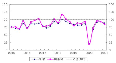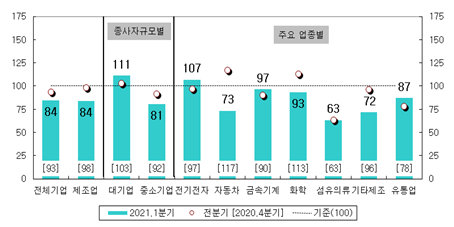 전체 기업들의 2021년 1분기 현황 BSI 지수는 시황(89)이 4분기 만에 하락세를 보이고, 매출(84)도 전분기에 이어 추가 하락했다.