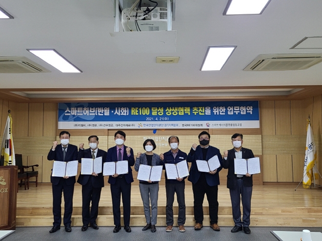 한국산업단지공단 경기지역본부(이하 산단공)이 21일 한국RE100위원회, 스마트에너지플랫폼협동조합 및 반월·시화산업단지 기업들과 함께 ‘스마트 허브(반월·시화산업단지) RE100 달성 상생협력 추진을 위한 업무협약’을 체결했다고 밝혔다.
