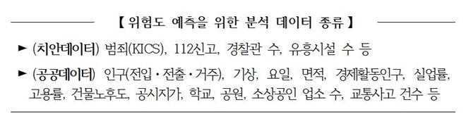 범죄예측 시스템은 치안⋅공공데이터를 통합한 빅데이터를 최신 알고리즘을 적용한 인공지능(AI)으로 분석해 지역별 범죄위험도와 범죄발생 건수를 예측하고 효과적인 순찰 경로를 안내하는 시스템이다.
