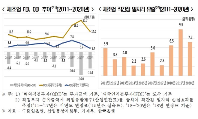 한경연은 지난 10년간 제조업 기업들의 해외투자가 국내로 유입되는 외국인투자를 크게 압도하면서 제조업 일자리가 대거 유출된 것으로 나타났다고 밝혔다. 2011~2020년 제조업의 해외직접투자는 연평균 12.4조 원에 달했던 반면, 외국인 직접투자는 해외직접투자의 절반도 안 되는 연평균 4.9조 원이었다. 같은 기간 제조업의 직접투자 순유출액(FDI-ODI)은 연간 7.5조 원 발생했고, 이로 인해 직간접 일자리가 매년 4.9만 개(누적 49.1만 개) 빠져나간 것으로 분석됐다.