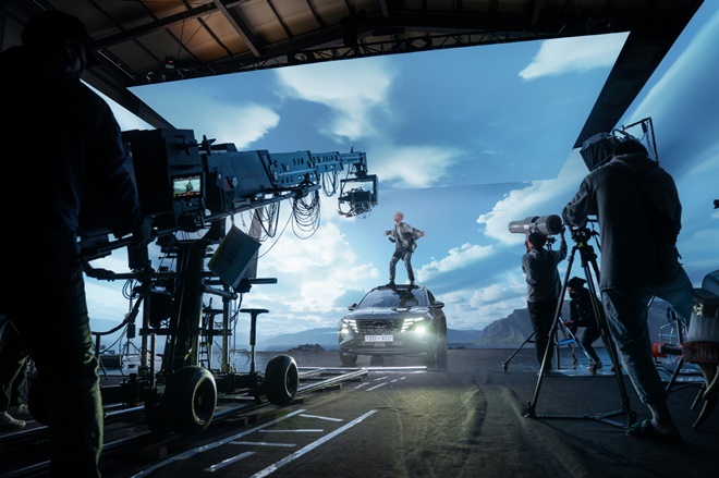 ▲비브스튜디오스 곤지암 R&D 스튜디오에서 통합제어솔루션 VIT를 활용해 자동차 주행 장면 및 실시간으로 환경 변화를 제어하며 촬영하는 모습.