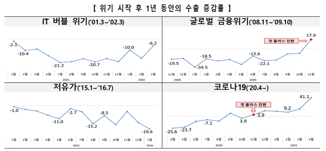 산업부는 작년 4월 수출이 2009년 금융위기 이후 가장 큰 폭으로 하락했지만, 과거 글로벌 교역 위기와 비교할 시 상대적으로 빠르게 회복하고 있으며 수출 증가율도 가장 가파른 상승세를 보이고 있다고 평가했다.