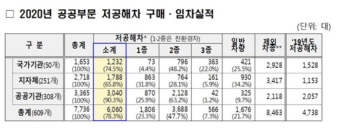산업통상자원부와 환경부는 2020년 공공부문 저공해차 및 친환경차의 보유현황과 구매실적을 조사하고, 그 결과를 발표했다.