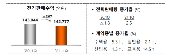 한전은 1분기, 수요증가로 인한 전력 판매량이 2.5% 증가했으나, 원가연계형 요금제 시행으로 전기판매수익은 267억원 감소했다고 밝혔다.