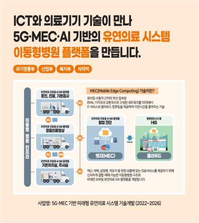 사업의 성공적인 추진을 위해 과기정통부(5G·MEC·AI기반 디지털플랫폼)·산업부(이동형병원체 개발 및 산업화)·복지부(실증사업) 간 긴밀한 협업을 추진해 소프트웨어와 하드웨어 기술개발부터 실증·인허가까지 5G·AI 디지털기반 이동형 의료시스템 기술개발을 선도하고 해외수출로 연계해 나갈 예정이다.