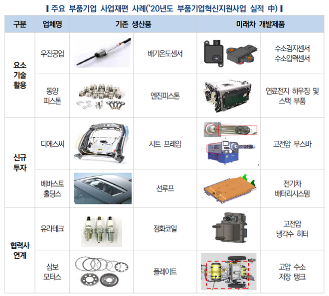 이들 부품기업은 각 기업이 처해 있는 환경과 특성을 바탕으로 미래차 사업재편을 전개한다. 우선 기존 부품에 적용하는 핵심기술을 고도화해, 유사 미래차 분야로 진출하는 방법이 있다. 예를 들어 산소·배기온도 센서를 만들던 우진공업은 수소압력센서로, 엔진피스톤을 만들던 동양피스톤은 연료전지 하우징 및 스택 부품으로 사업을 전환하는 식이다.