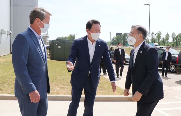 ▲문재인 대통령이 22일 오후(현지 시각) 미국 애틀랜타 SK이노베이션 전기차 배터리 공장을 방문, 최태원 SK회장(가운데), 브라이언 켐프 조지아 주지사 영접을 받고 있다. (출처 : 연합뉴스)